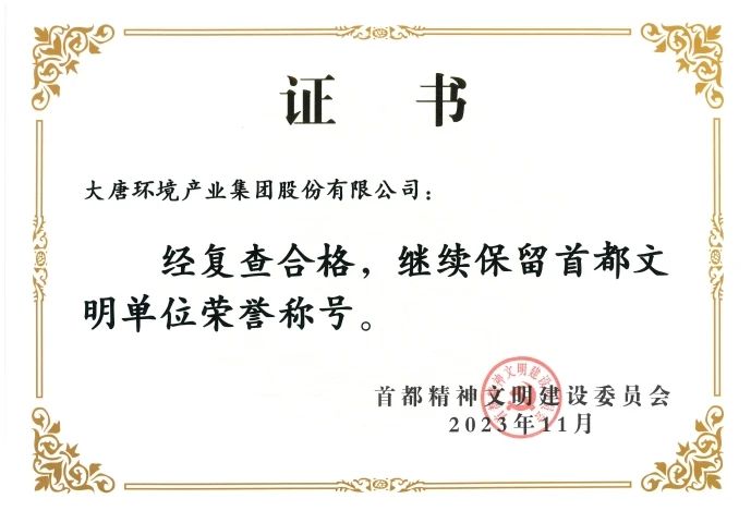 据了解,“首都文明单位”每三年评选一次,并对已获“首都文明单位”进行复查,是首都精神文明建设领域的重要荣誉,旨在表彰创建工作扎实、道德风尚良好、管理科学规范、文化建设有力、内外环境优美、公众评价优良的优秀单位。大唐环境将以此项荣誉为激励,坚持企业发展与精神文明建设“两手抓、两手硬、两促进”,持续深入宣贯卓越文化,不断创新工作方法,丰富精神文明创建体系的内涵与外延,对标杆、补短板、强内功、增效益,推动文明创建工作再上新台阶,为企业高质量发展提供坚强思想保障、凝聚强大精神力量、营造良好文化氛围。