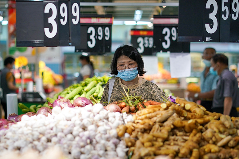 市民在江苏省无锡市经开区华润万家超市购物(2022年7月7日摄)。江苏省无锡市在做好疫情防控的同时,积极制定相关方案,制作城市保供地图,组织大型商超、市场正常运营,全力保供稳价,端稳市民“菜篮子”。新华社记者 李博 摄