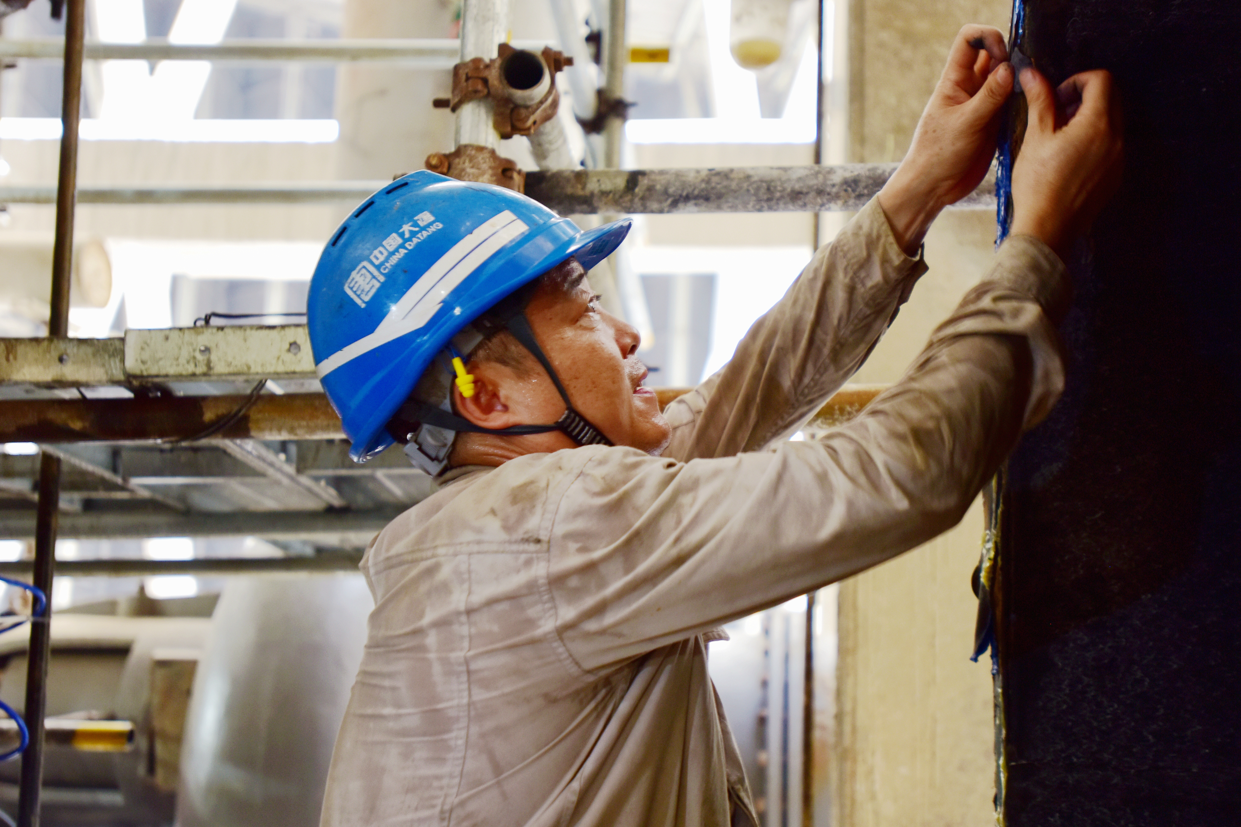 大家按照检修规范工序开始拆卸更换浆液循环泵入口软连接部件,并清理干净原来的密封胶,重新安装垫片、涂抹密封胶。魏巍和赵林俯下身,在狭窄的空间里反复调整部件位置。