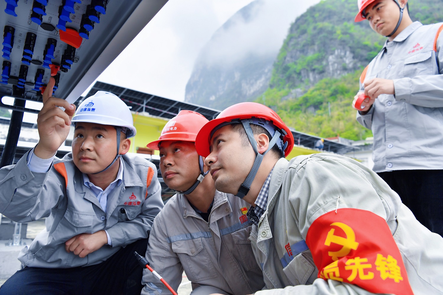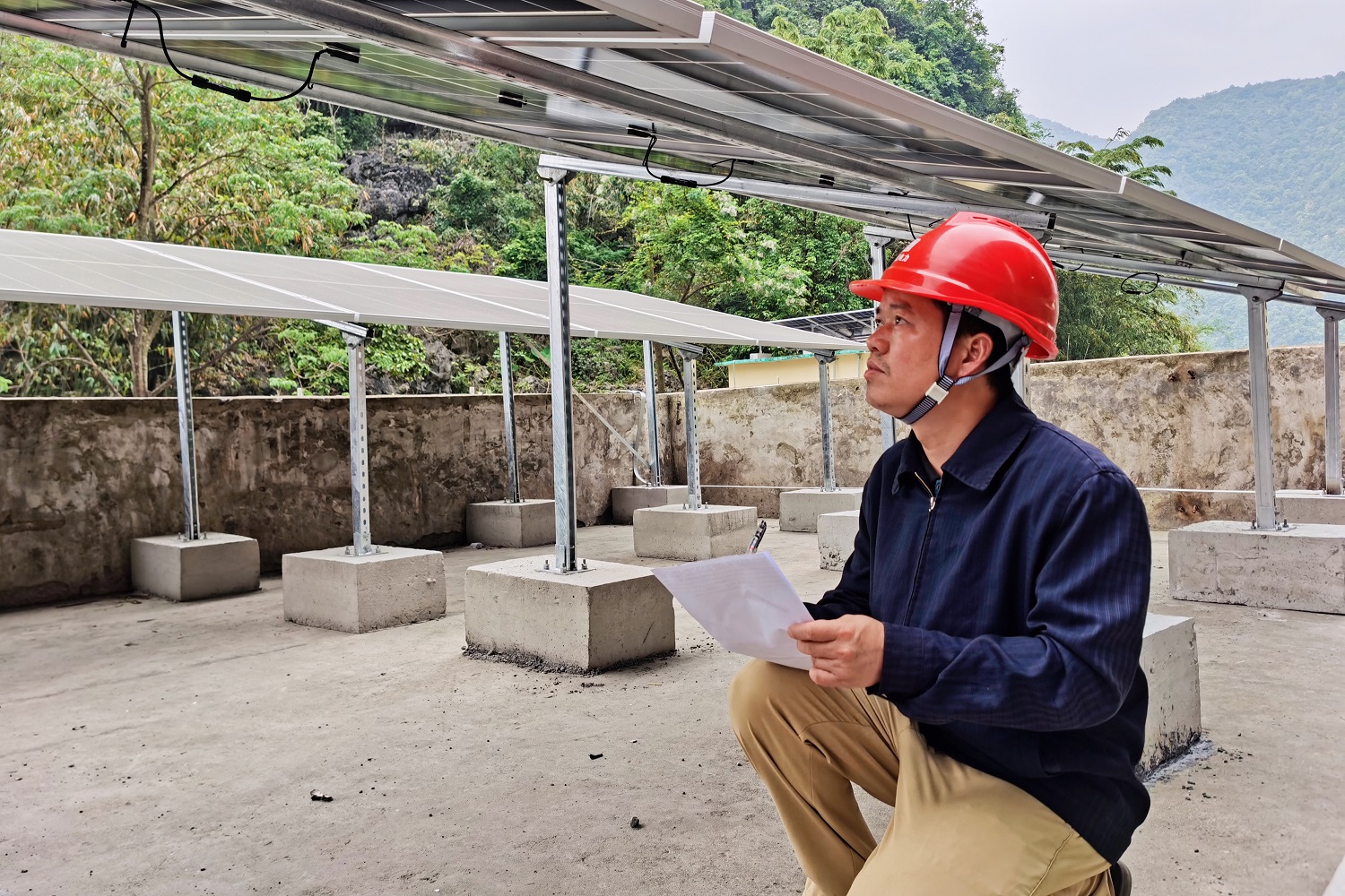 驻村工作队与施工单位人员正在查看光伏板安全情况