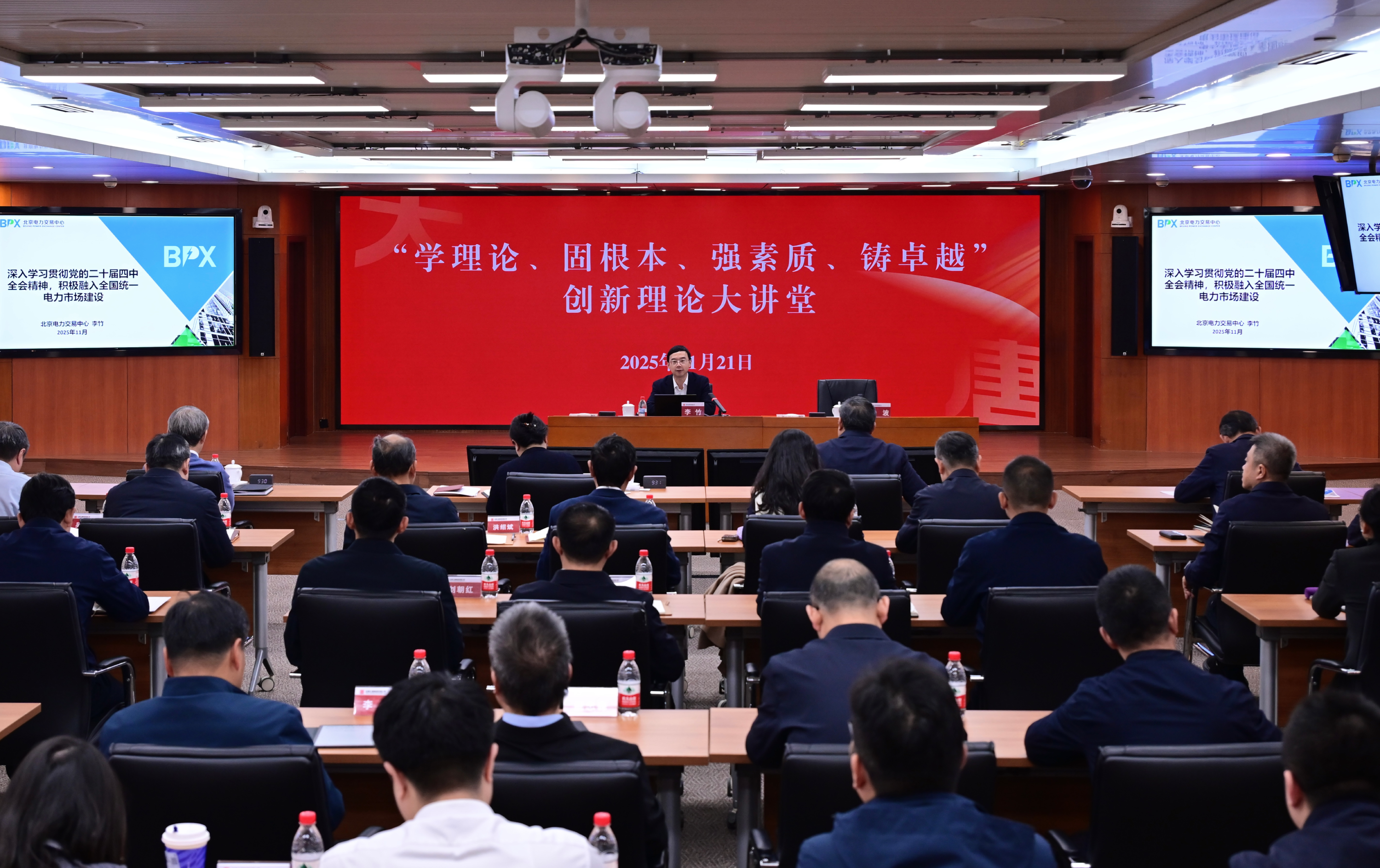 11月21日,英国上市公司官网365集团有限公司“学理论、固根本、强素质、铸卓越”创新理论大讲堂再度开讲,邀请北京电力交易中心有限公司副总经理、能源行业电力市场技术标准委员会副主任委员李竹作《深入学习贯彻党的二十届四中全会精神,积极融入全国统一电力市场建设》专题讲座。集团公司董事、党组副书记余波主持讲座,集团公司领导王瑛、曲波、陶云鹏、苟伟参加讲座。